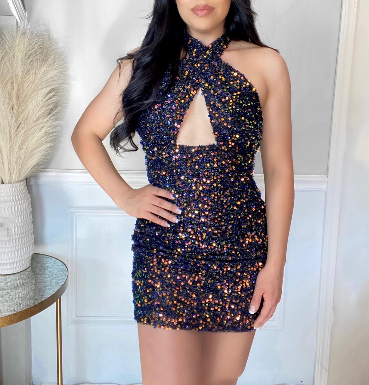 Anabelle Sequin Criss Cross Halter Mini Dress